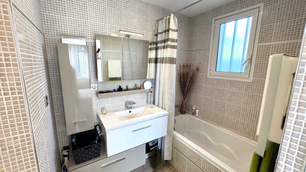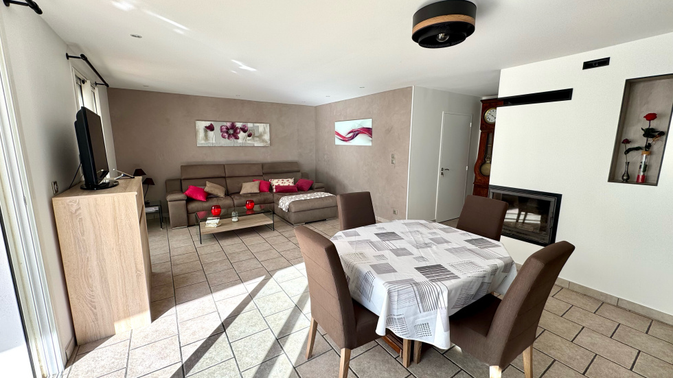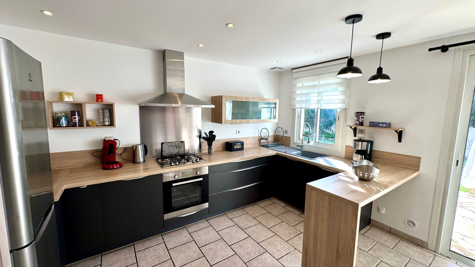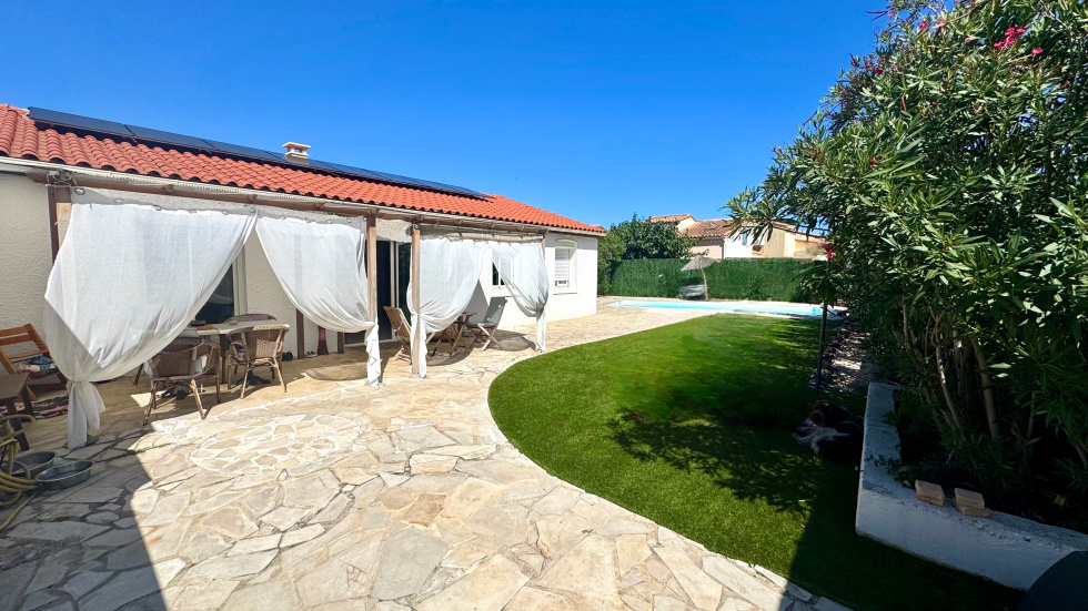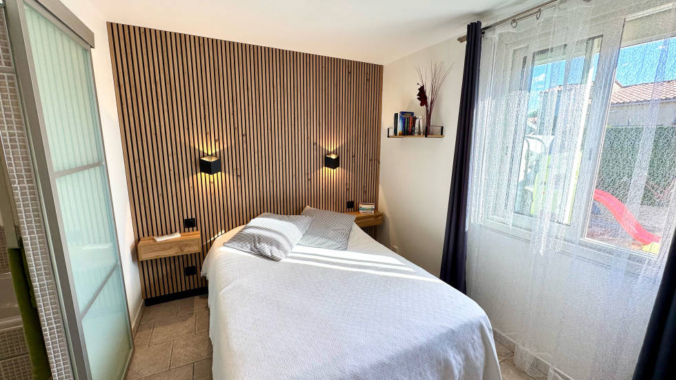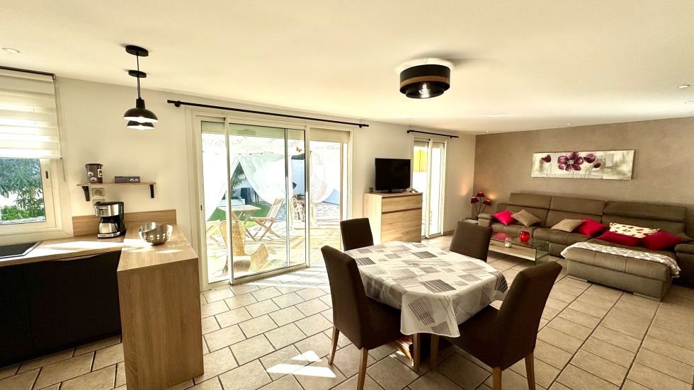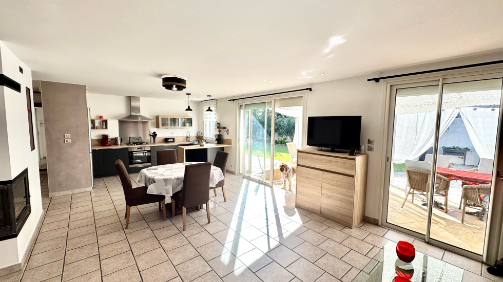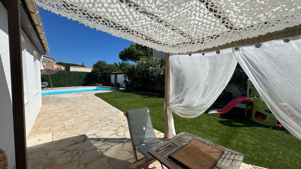 SAINT CYPRIEN PLAGE - EXCLUSIVITE - Coup de coeur pour cette villa de plain-pied située dans un quartier calme et proche des commerces. Vous serez séduit par son grand terrain arboré avec belle piscine à l'abri des regards. Elle se compose coté jour, d'un beau séjour lumineux avec une grande cuisine ouverte et équipée. Coté nuit, 2 chambres dont une suite, avec salles d'eau et wc. Coté prestations, elle dispose de la climatisation, du double vitrage, des volets roulants électriques et panneaux photovoltaïques et d'un garage de 19m².