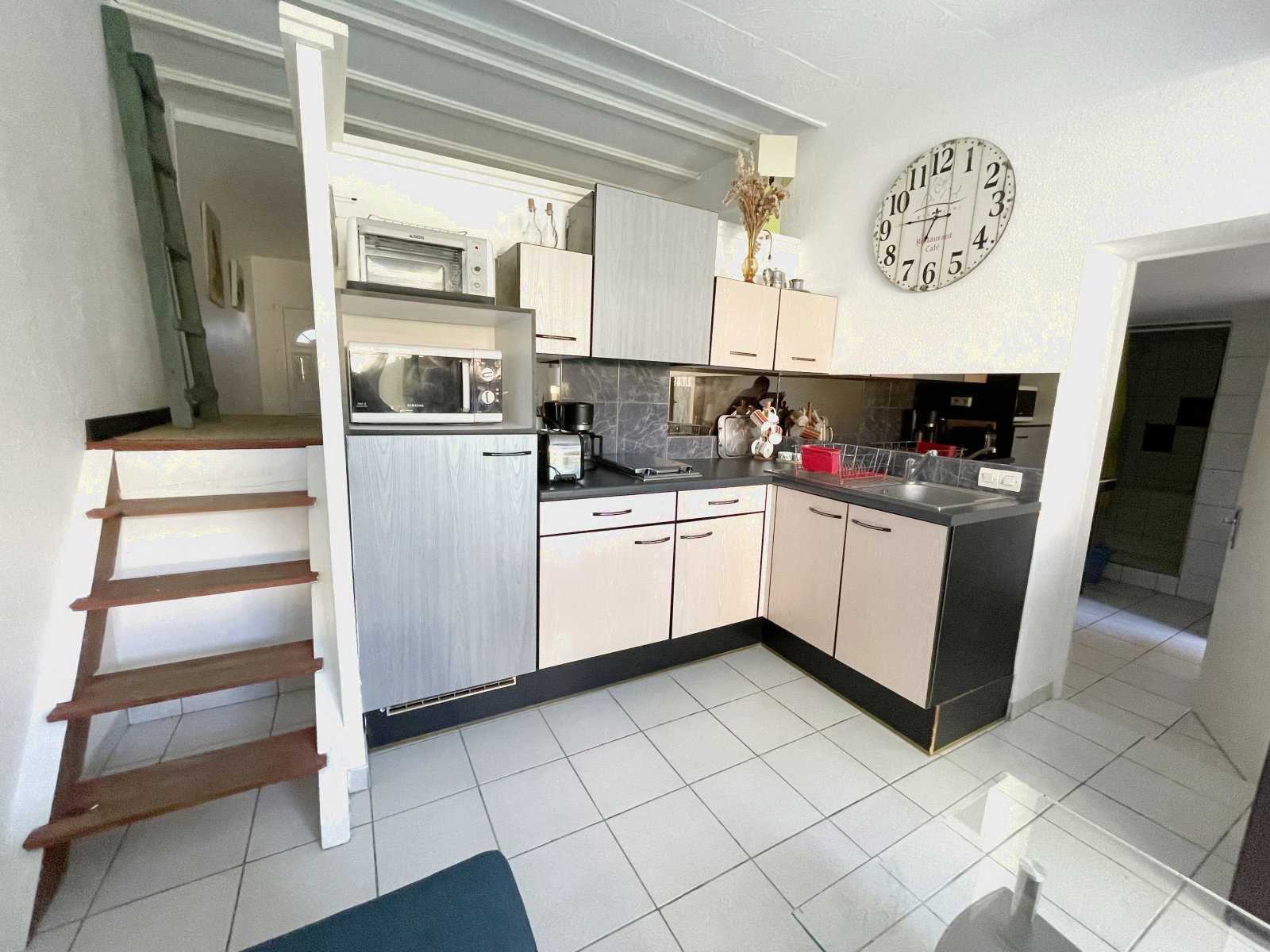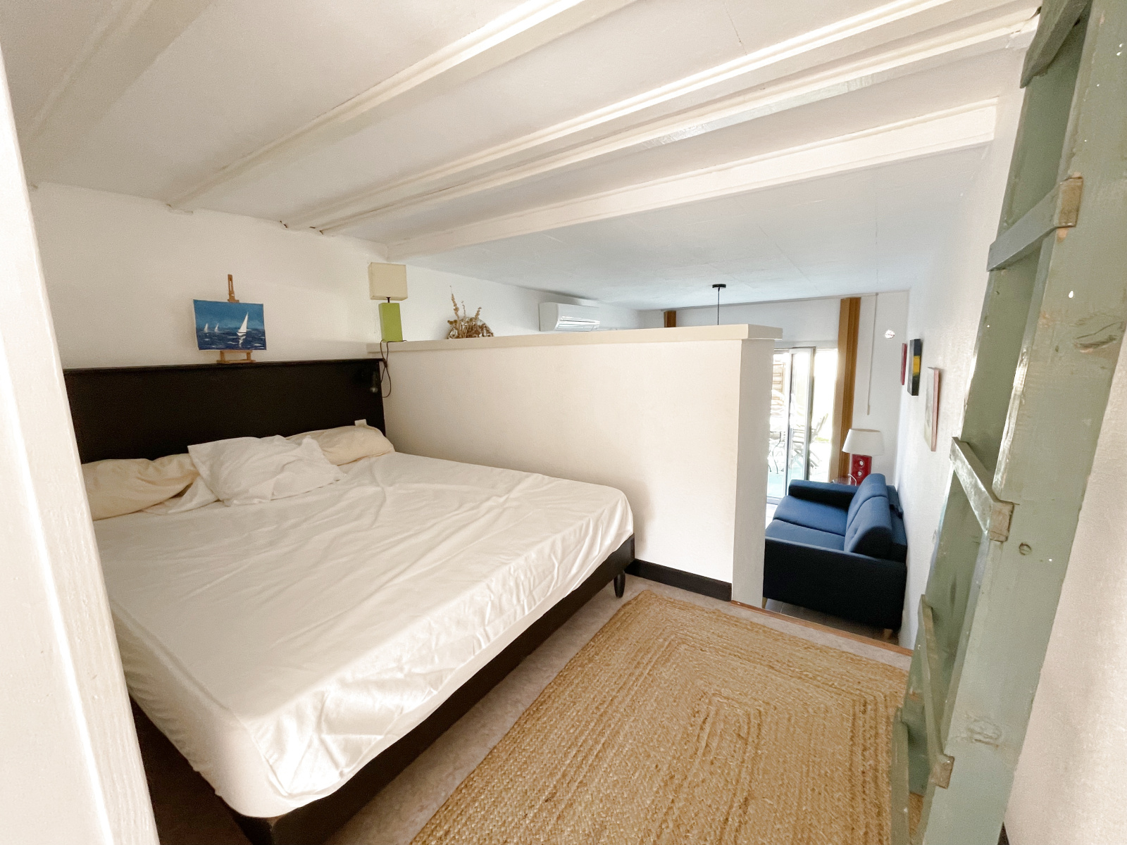 Il se compose d' un salon ( canapé convertible en 140 cm, télévision ), une cuisine ouverte équipée ( four, plaque gaz deux feux, réfrigérateur avec freezer, micro-ondes, cafetière à filtre, bouilloire, grille pain ), un coin nuit légèrement surélevé avec un lit en 140cm, une salle d'eau et un wc indépendant.