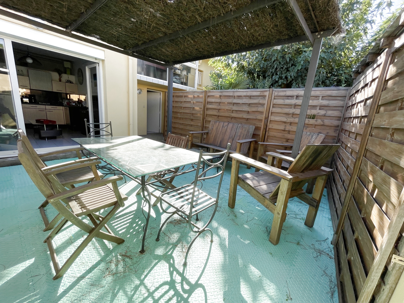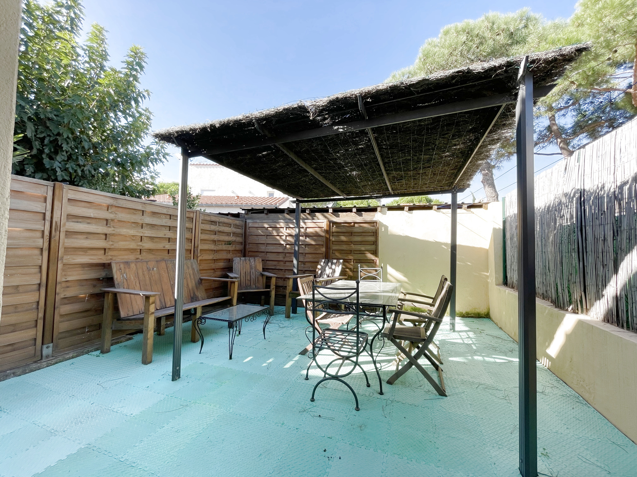 Ce bien dispose d'un bel extérieur avec un salon de jardin ainsi que d'une place de parking fermée devant le logement.