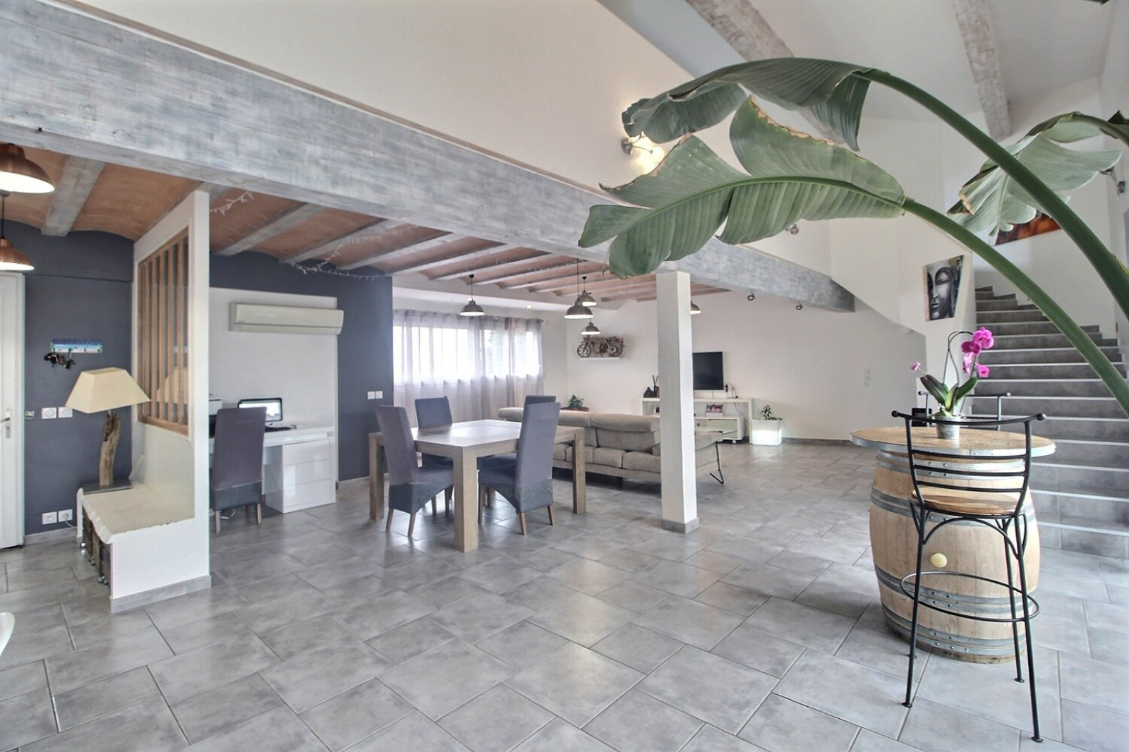 Coté jour, elle est composée d'un séjour cathédrale de 78 m² avec cuisine us équipée ouvert sur un espace extérieur avec piscine et une belle terrasse vue sur le canigou.