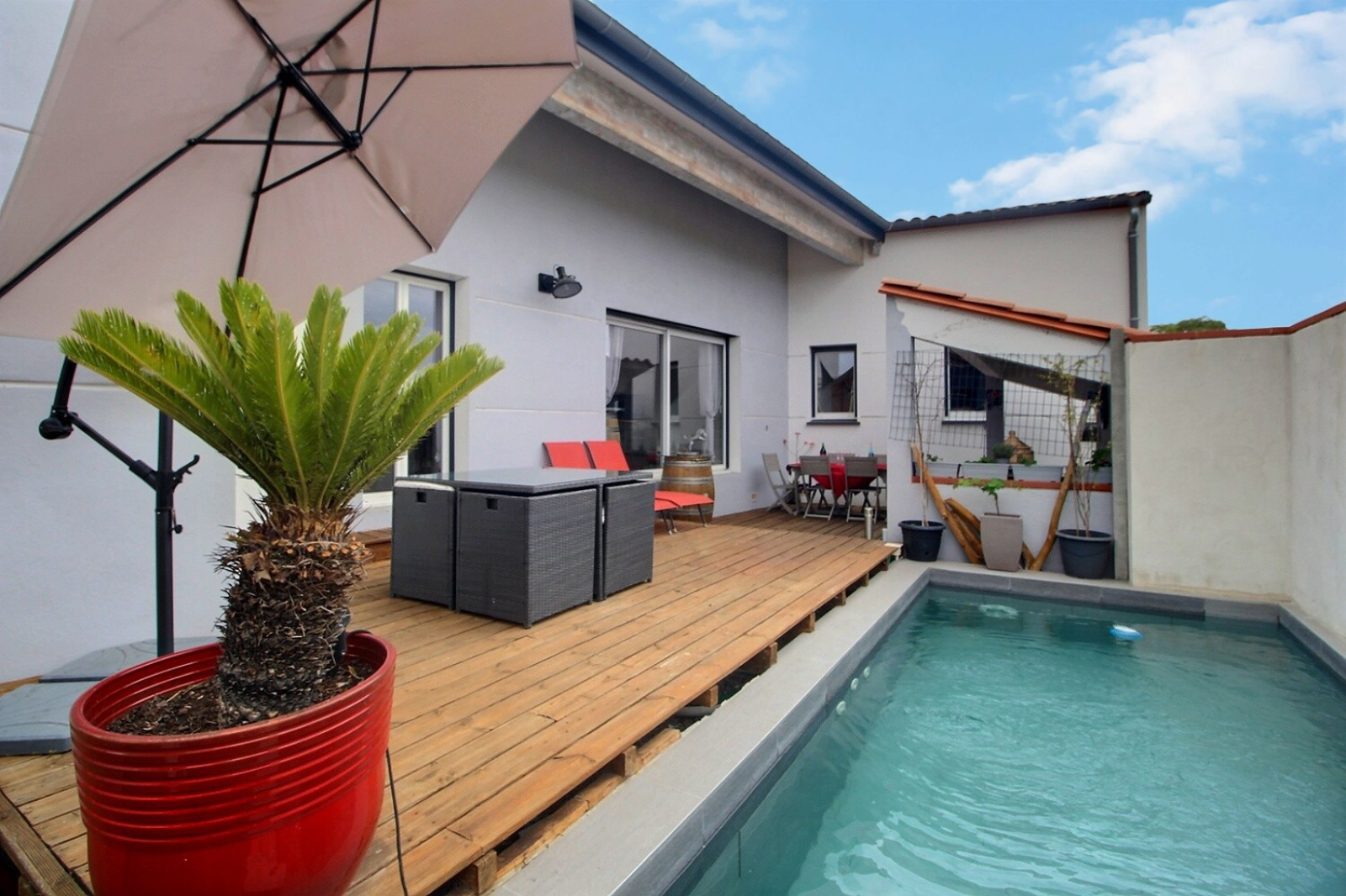 Alénya (66200)Cette très jolie villa contemporaine 3 faces avec poutres apparentes sur 440 m² de terrain avec piscine est situé dans un quartier recherché.