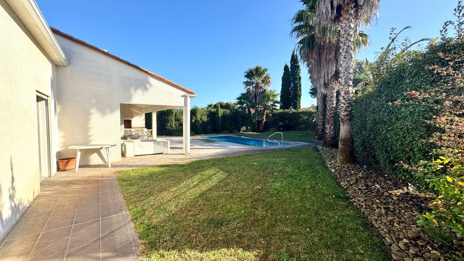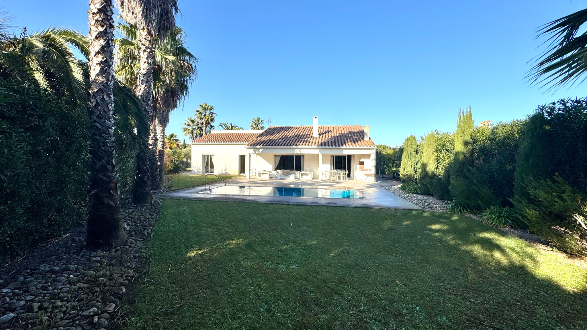 Saint-Cyprien-Plage (66750)SAINT CYPRIEN PLAGE - Vous serez séduits par cette villa de plain-pied dans un cadre verdoyant près du golf. Elle se compose d'un beau séjour donnant sur jardin et piscine, une cuisine séparée, 3 chambres, 2 salles d'eau, garage, forage.