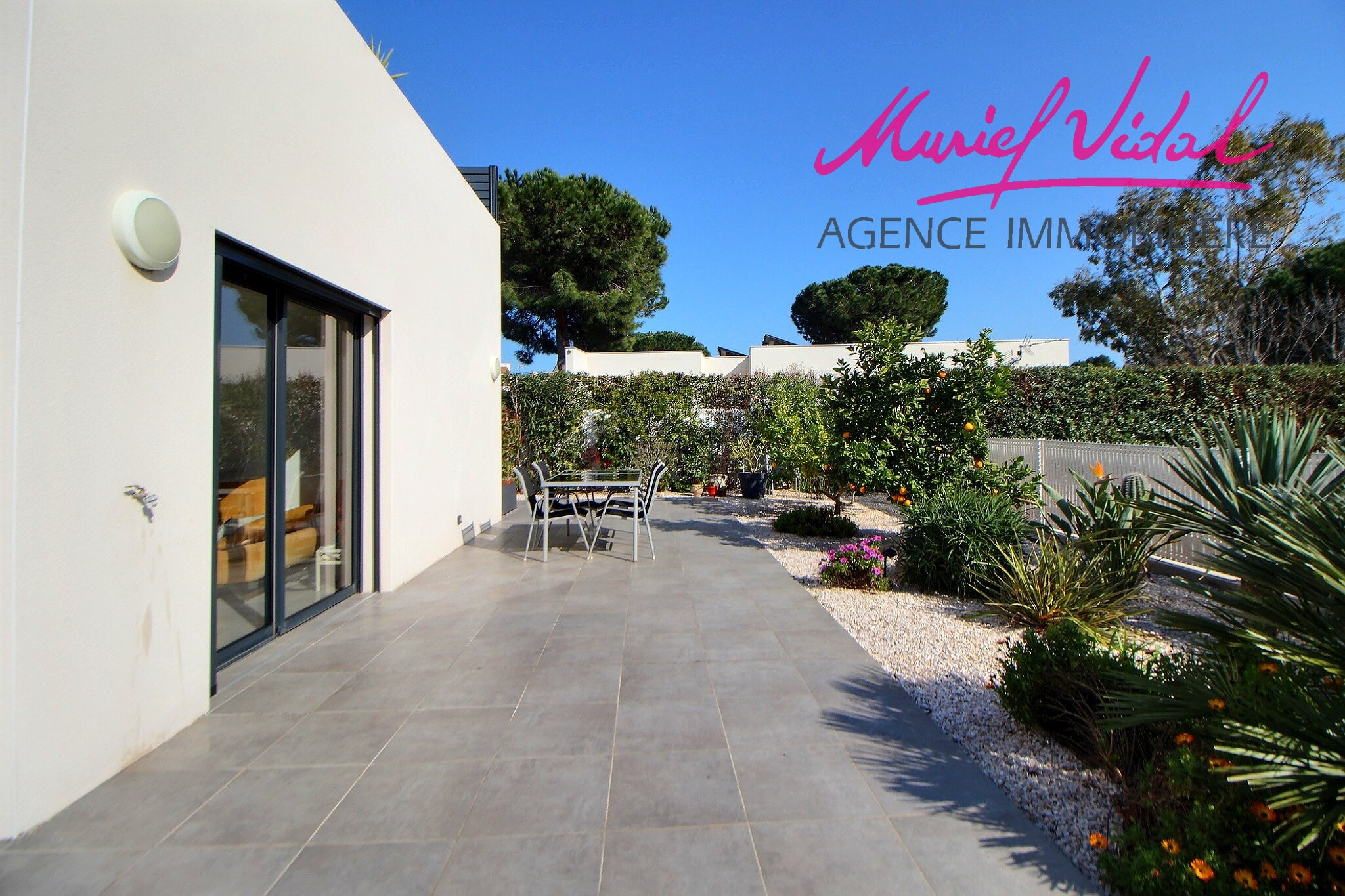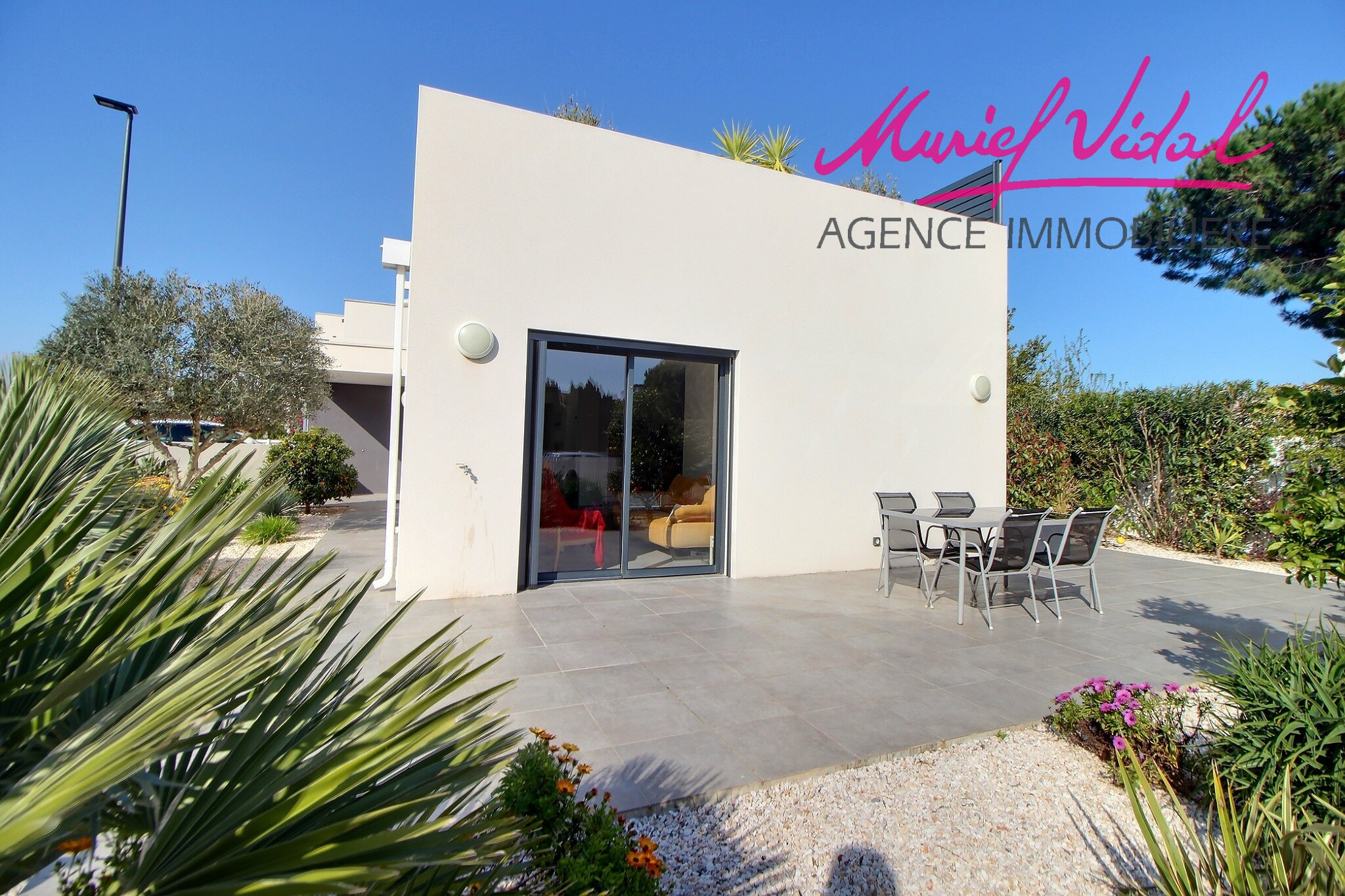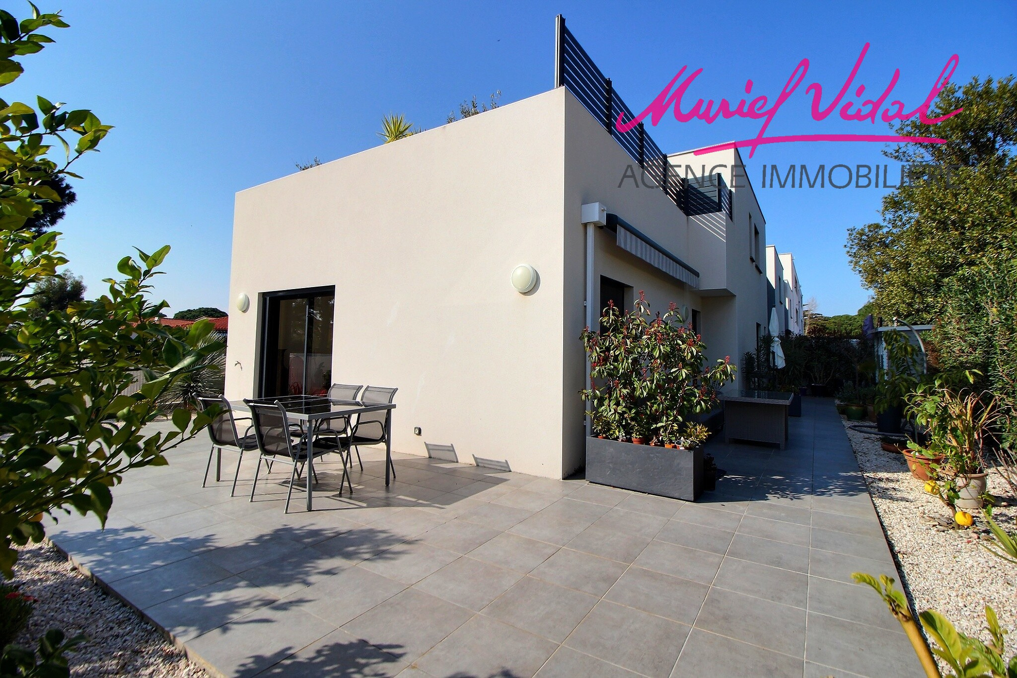 Proche port, plage et commerces, superbe villa de 2021 en 3 faces avec jardin arboré, terrasses et solarium.