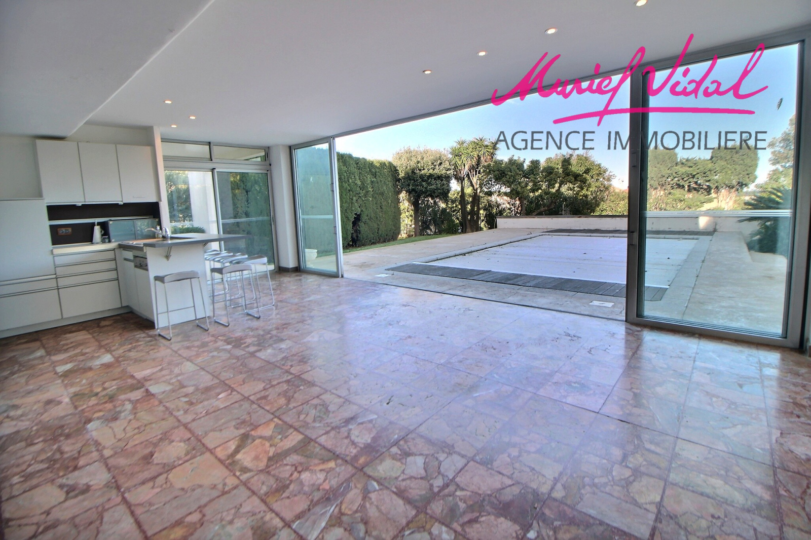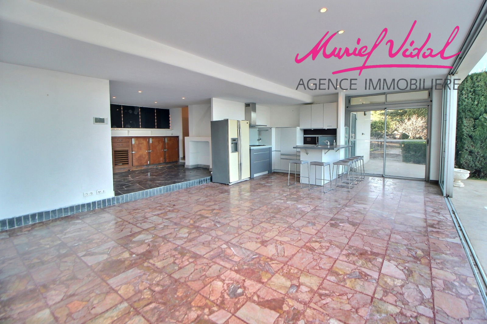 - en rez de jardin, face à la piscine en émaux de Briare (et volet roulant), un grand séjour avec cuisine intégrée de 53 m2,