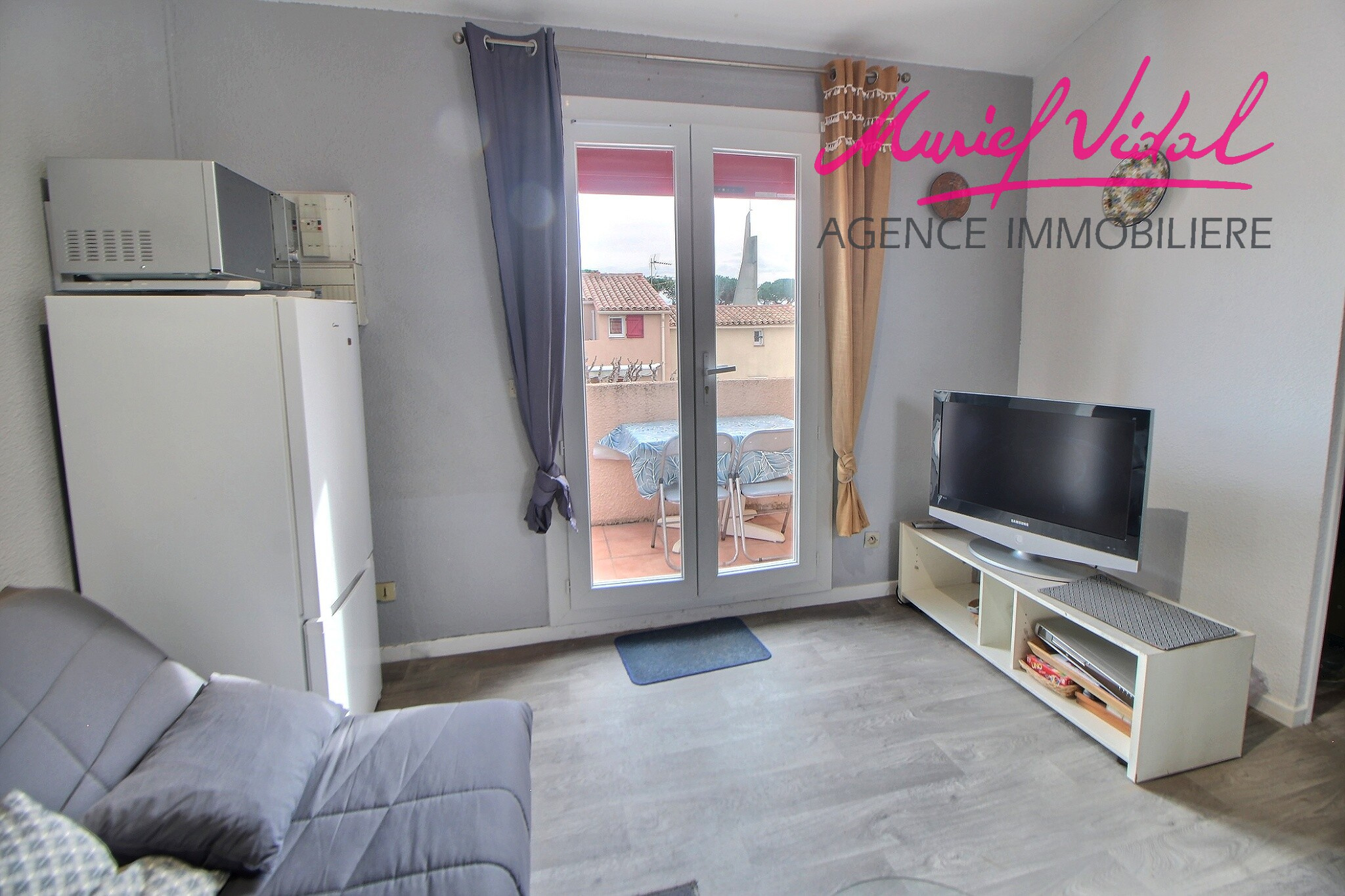 Saint-Cyprien (66750)Situé au port à 3 mn à pied des commerces et de la plage, appartement climatisé et rénové. La terrasse offre une vue dégagée et ensoleillée.Le salon cathédral est ouvert sur la cuisine US équipée.