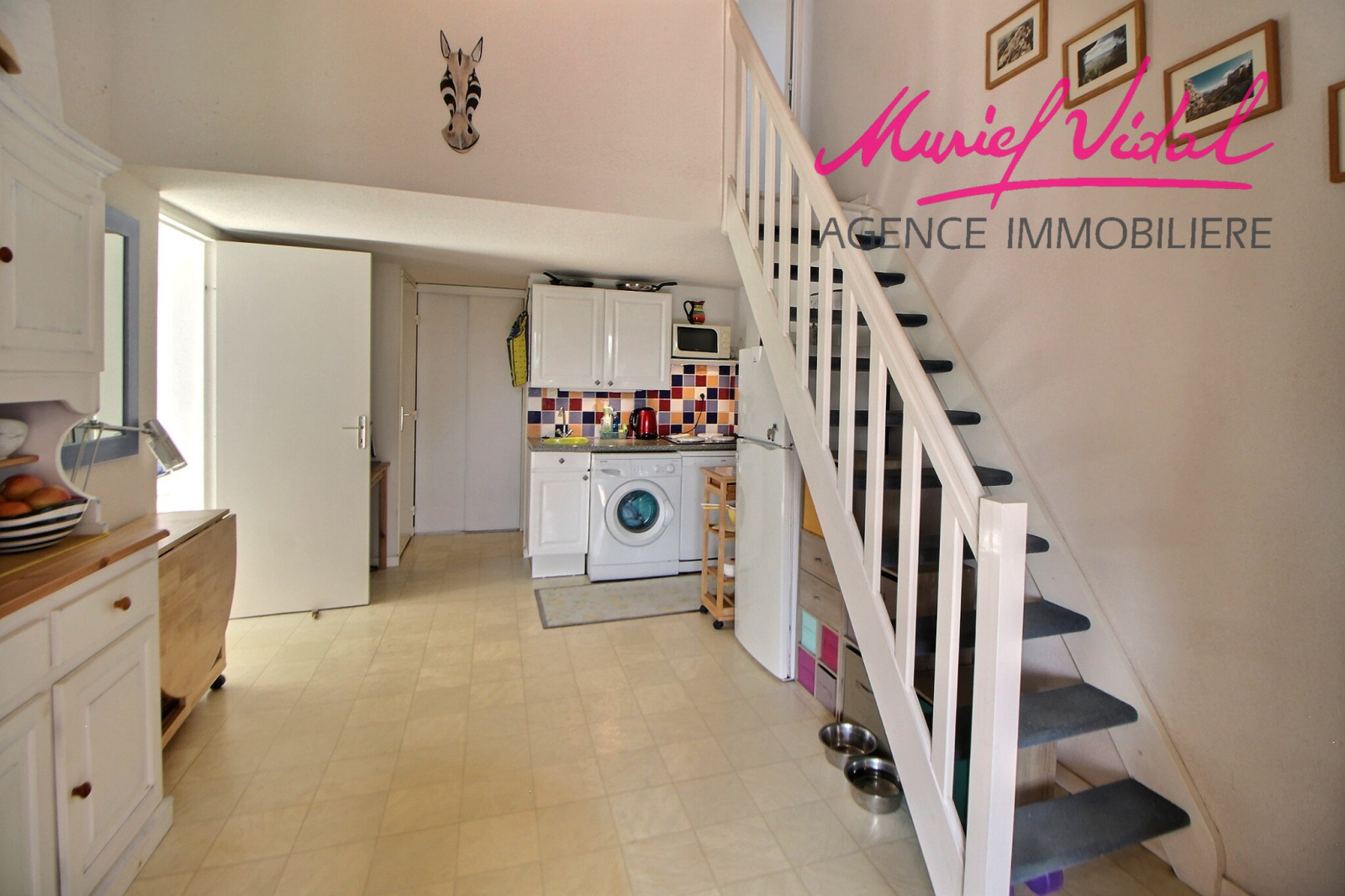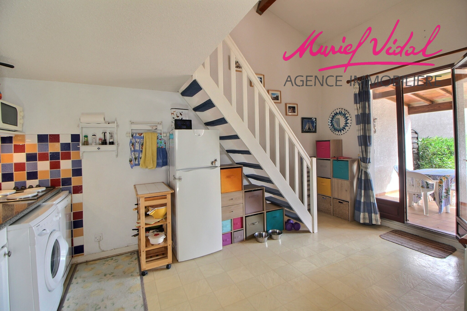 Au rez-de-chaussée,un séjour avec une cusine équipée, une chambre et une salle d'eau.